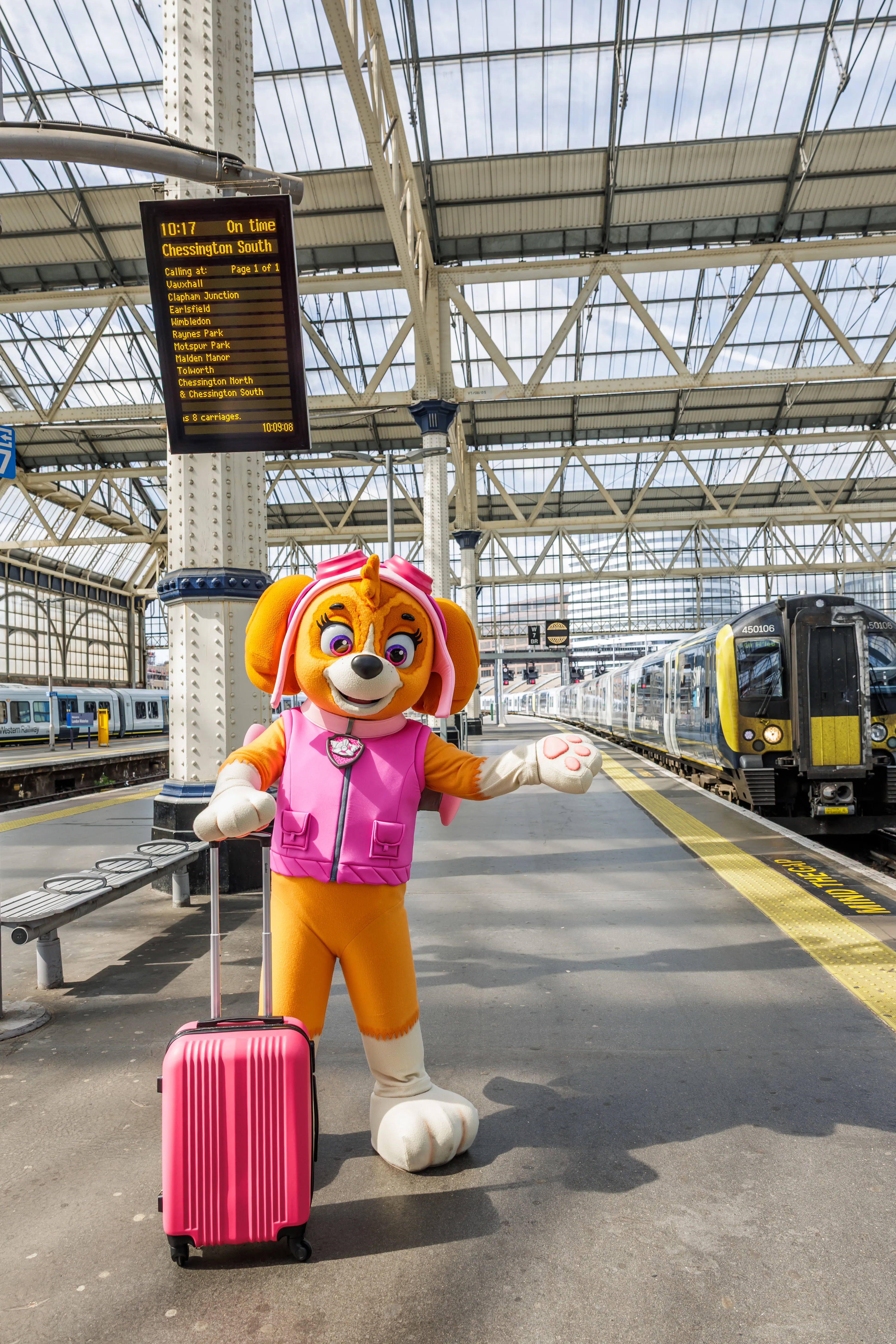 3 July 2025 | London, UK: Commuters at London Waterloo station couldn’t believe their eyes this week as a very special pup appeared, ready for an adventure. PAW Patrol’s Skye was spotted on Platform 4, bags in paw. The famous pup – from the hit series produced by Spin Master Entertainment and airing on Nickelodeon – posed for photos, before boarding her South Western Railway train to Chessington World of Adventures to oversee an exciting new development at the theme park.