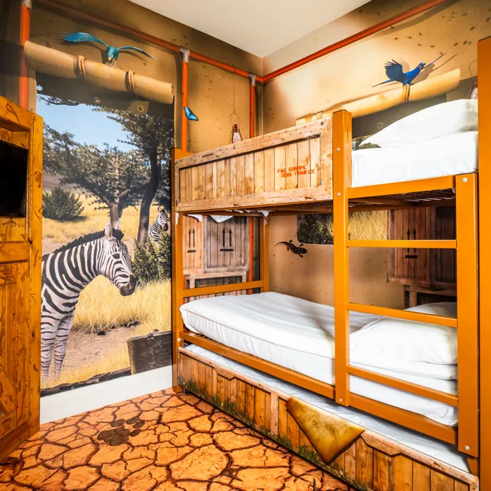 Step into your fully-themed room which includes animal prints and African scenery. Embark on a wild adventure into the depths of the African plains where the kids can enjoy their own separate sleeping area. Access to the Savannah Splash Pool is included in your stay.