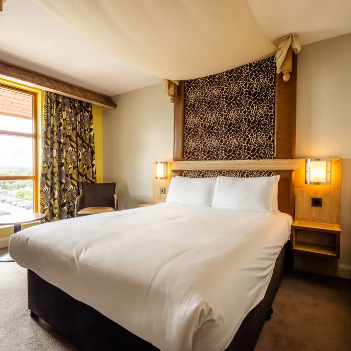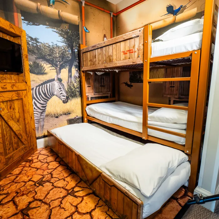 Step into your fully-themed room which includes animal prints and African scenery. Embark on a wild adventure into the depths of the African plains where the kids can enjoy their own separate sleeping area. Access to the Savannah Splash Pool is included in your stay.